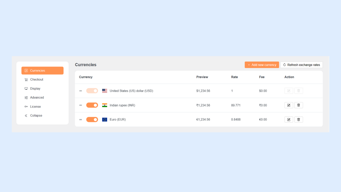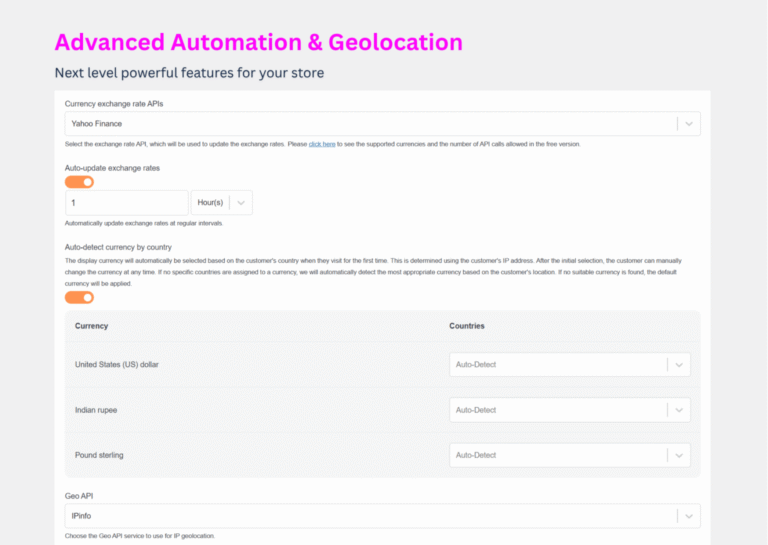 Automatically detect customer location, apply live or custom exchange rates, and deliver a seamless multi-currency experience—fully integrated with WooCommerce.