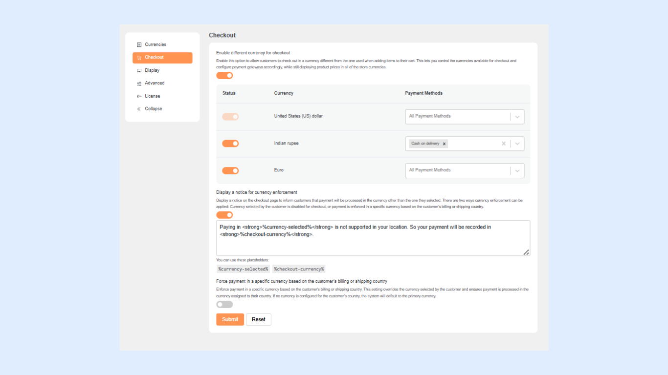 Automate currency handling while keeping full control over how customers pay. Configure checkout rules, assign payment gateways by currency, and rely on broad compatibility with popular WooCommerce extensions.
