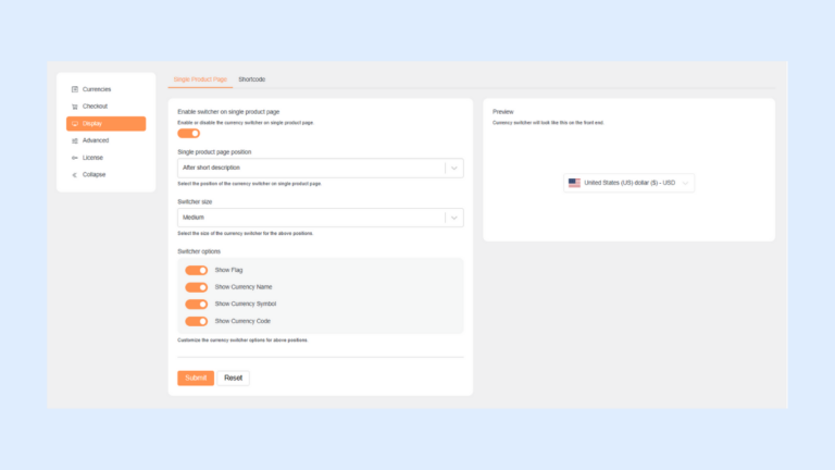 Give customers full control with a flexible currency switcher that blends perfectly into your store. The selected currency remains consistent from product pages to checkout, ensuring a smooth and predictable buying journey.