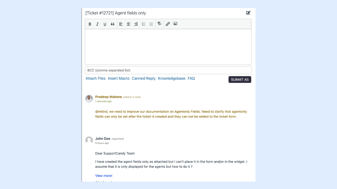 SupportCandy lets your team collaborate using private internal notes while keeping conversations hidden from customers. With advanced and saveable ticket filters, agents can quickly organize, track, and manage tickets the way they work best.